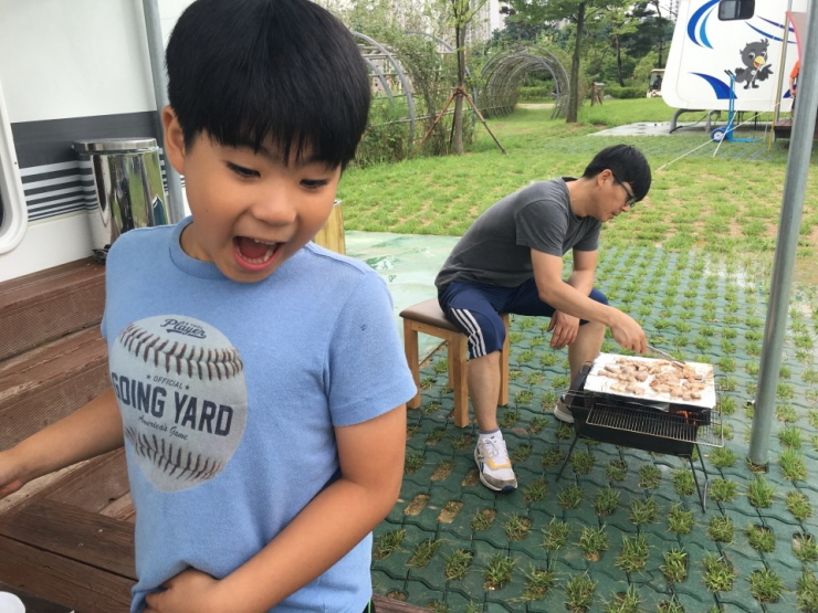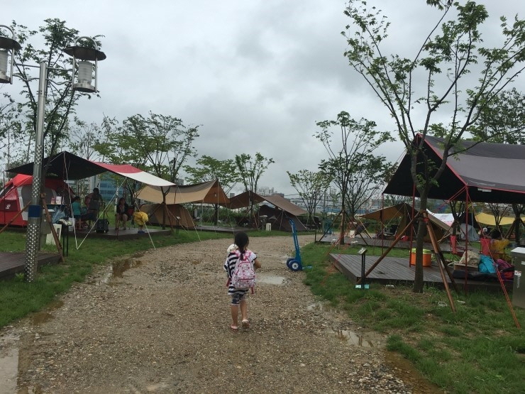 뒷 배경에 높은 아파트가 보이는 도심 속 캠핑장이라 정말 이색적인 느낌였어요. 이미 텐트를 치고 여유롭게 커피를 마시며 도란도란 얘기를 나누는 사람들도 보였고 아이들은 즐겁게 뛰어놀고 있었죠.