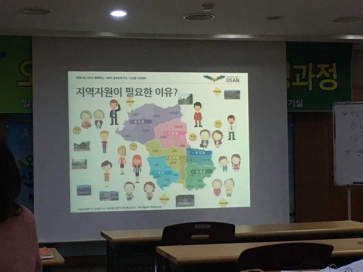 우리마을, 우리가 주도적으로 만들어 가자! 우리가 살고 있는 지역의 자원은 무엇이 있을까? 우리지역을 우리가 스스로 지켜낼 수 있는 방법은? 오산시는 11월19일 토요일 (9:00~13:00) 오산시청 물향기실에서 [오산시 시민 마을강사 교육] 개강식을 알리며 이 궁금증을 해결할 수 있는 교육의 길을 활짝 열어주었다. “지역발전을 위해 열린 생각으로 공동체 의식을 해명할 수 있는 마을강사가 되길 바란다”는 오산시 복지교육국 이영애 국장의 교육 시작 축하인사말이 전해졌다.