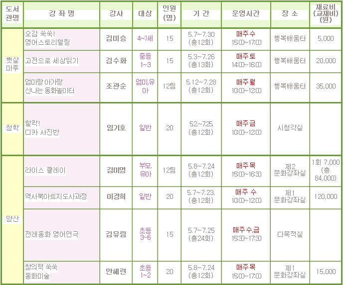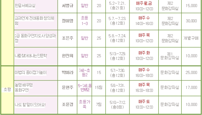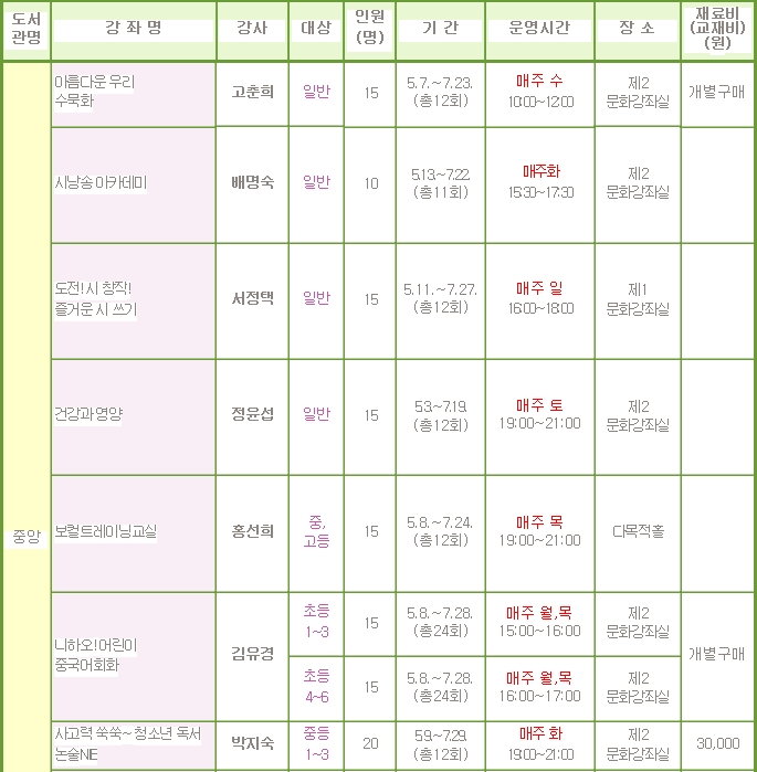 5월부터 7월까지 도서관 제3기 문화강좌가 이루어지거든요. 이번 금요일인 4월 11일부터 수강신청이 있으니, 문화강좌 내용을 미리 알아보시고 접수하시길 바래요. 인기있는 강좌는 몇 분 만에 마감된답니다.