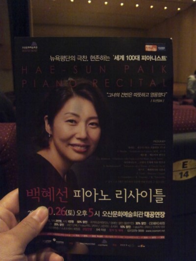 10월 26일 오후 5시. 오산 문화예술회관 대공연장에서 "백혜선 피아노 리사이틀"이 열렸다. 오산 시내 곳곳에 안내 현수막이 걸려있었던터라 아이들과 꼭 가보고 싶었던 공연. OSTV시민기자인 김영진씨가 표를 주셔서 "앗싸~"하며 다녀오게 되었다.