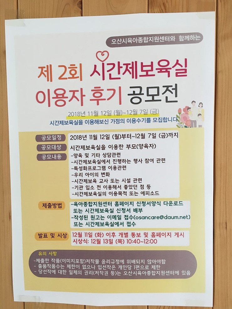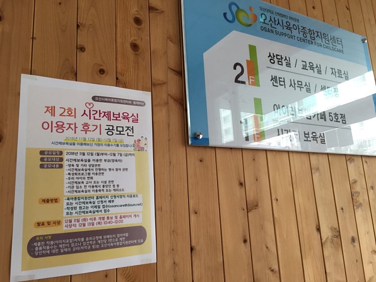 오산시 육아종합지원센터 1층에 위치한 시간제 보육 이용 후기 공모전도 진행 중인데요.
