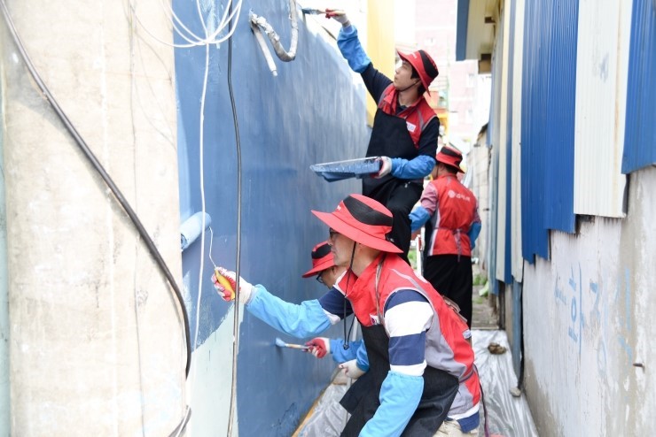 ▲ 오매장터 안 낡은 담벼락에 벽화작업을 하고 있는 LG이노텍 직원들