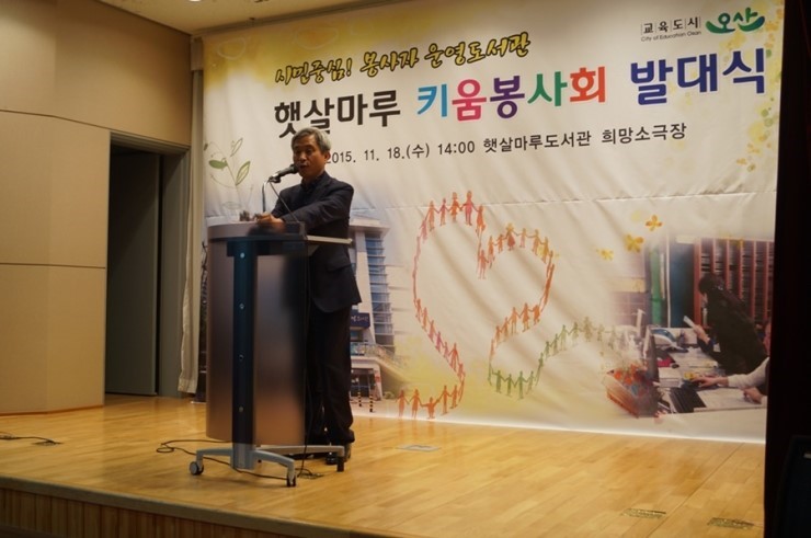 지난 7월부터 봉사자 50여명을 모집 하여 자원 봉사 기본 교육과 도서관 프로 그램 "코라스3 "교육을 마치고 11월18일 곽상욱 시장과 내빈들을 모시고 시민중심 도서관 발대식을 가졌다.