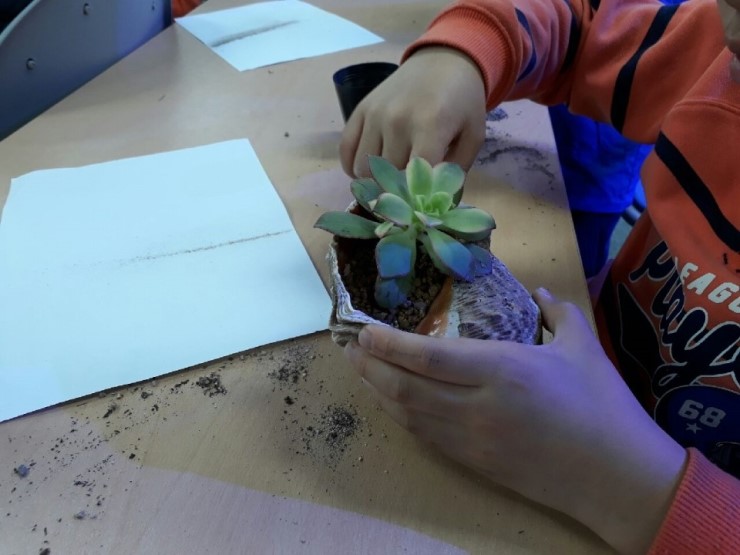 소라껍데기를 이용해 나만의 정원도 예쁘게 꾸며 보았습니다. 소라 껍데기에 흙을 넣고 다육이를 심으니 작고 예쁜 다육화분이 완성되었네요. 아이들이 직접 만든 화분을 보며 뿌듯해하는 모습을 볼 수 있었습니다.