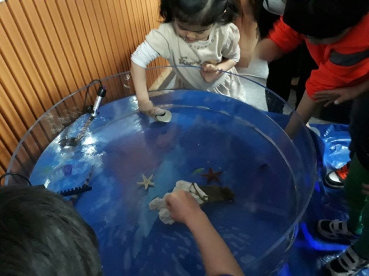 바다에서만 볼 수 있는 생물들을 가까이 보고 직접 만져보니 아이들은 신비롭기만 합니다. 마치 작은 아쿠아리움이 도서관으로 찾아온 것 같지요?