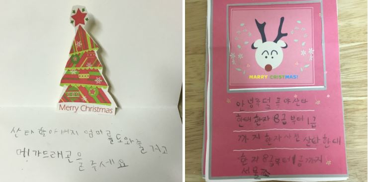 '어디서 많이 봤는데, 이게 포인세티아구나!' 빨간색과 초록색 잎으로 싱그러운 포인세티아가 나와 마주쳤다. 18세기, 이 식물이 베들레헴의 별의 상징이라고 생각한 멕시코인들에 의해 빨간색과 초록색이 선명하게 대비되는 포인세티아가 크리스마스 계절과 어울리게 되었다. 크리스마스 시즌에 개화하는 특성 때문에 미국과 유럽에서는 전통적인 크리스마스 장식화로 널리 사용되어 왔으며 우리나라에서도 겨울철 분화로서 이미 유명하다. ▲ 크리스마스 장식화 포인세티아 '포인세티아가 크리스마스 대표식물이구나!' 그래, 크리스마스가 코앞인데 크리스마스에 대해 좀 더 재미나게 알아볼까? 일단, '크리스마스' 하면 떠오르는 것을 생각해 봤더니 순 추억만 뭉게뭉게. '아니아니, 옛추억 말고 상징적인거 그런거를 떠올려야지.' 이런 정서는 뒤로 미루고 상징적 탐구모드로 돌입하며 파고 들어갔다. 크리스마스 트리 크리스마스에 전나무 소나무로 만든 크리스마스트리(성탄목)을 세우는 풍습은 독일에서 유래되었다고 한다. 독일에는 기독교가 전파되기 전부터 겨울에 집밖이나 집안의 전나무를 장미나 사과, 색종이 등으로 장식하는 풍습이 있었다고 한다. 크리스마스 트리가 상록수인 것은 영원성을 상징하고 모양이 삼각형인 것은 성삼위를 상징한다고 해석하기도 한다. ▲ 가족과 함께 만든 크리스마스 트리 크리스마스 카드 크리스마스 때 감사의 마음을 전하는 일반적으로 알려진 최초의 카드는 1843년 영국의 헨리 코울 경울 위해 존 호슬리가 제작한 코올-호슬리 카드 였는데 이 카드를 같은 영국사람인 조빈스라는 사람이 석판 인쇄를 이용해 수 천장씩 만들면서부터 판매되기 시작했다고 한다. 특히 1860년 새로운 원색 인쇄기술이 발달하여 카드의 종류도 다양해지고, 값도 내리면서 부터 크리스마스가 오면 예쁜 크리스마스카드를 사람들에게 전해주며 서로의 따뜻한 마음을 주고 받고 있다고 한다. ▲ 산타할아버지께 전하는 마음의 편지 지팡이 사탕 (Candy Cane)