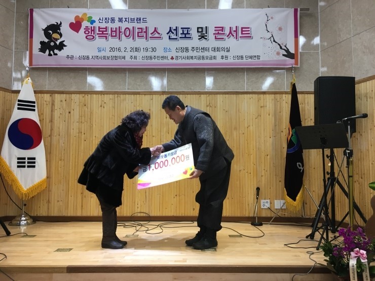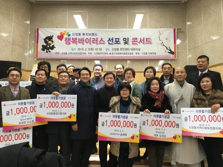 2월2일 오후 7시30분 깜깜한 어둠을 뚫고 신장동 전체에 밝은 빛으로 에워싼 행복의 소리가 울려퍼졌다. 소리가 나는 곳으로 발길을 재촉한 신장동주민센터 3층에서는 이미 많은 내빈과 주민들로 발 디딜 틈 조차 없었고, 그 안에서 기부를 하는 따뜻한 모습을 볼 수 있었다.