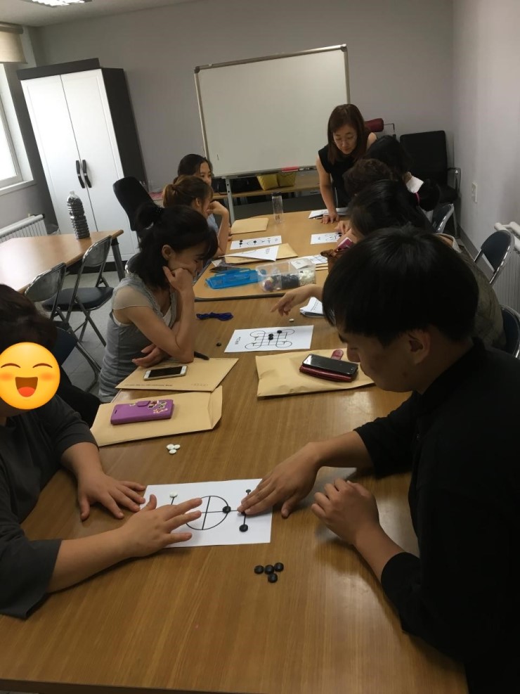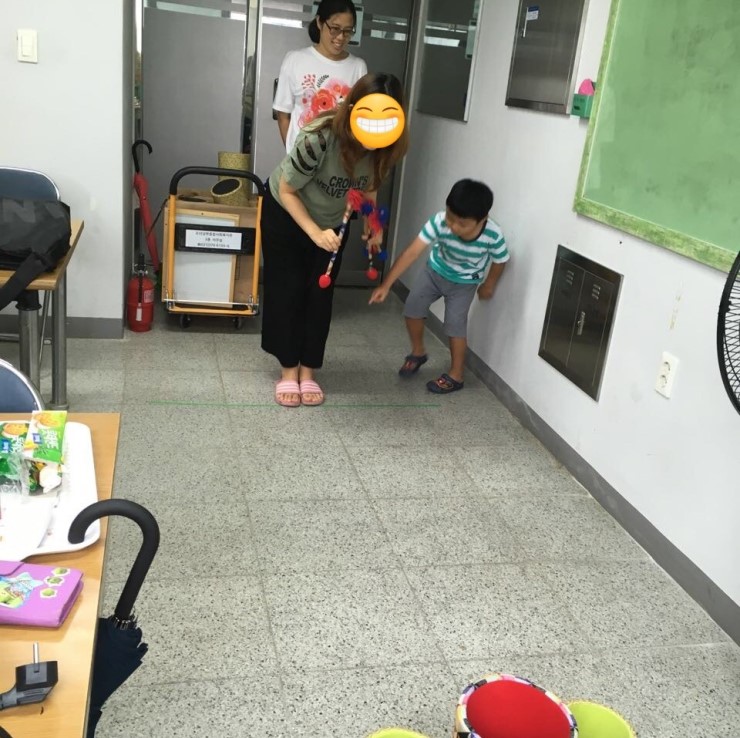 여름방학 중이라 아이와 함께 수업을 듣기도 했는데요. 이렇게 아이와 엄마가 함께 재미있게 들을 수 있는 수업은 전래놀이밖에 없으리란 생각이 들었어요. 투호놀이를 하는 동안 선수가 선을 밟는지 안 밟는지 심판의 역할을 톡톡히 했답니다.