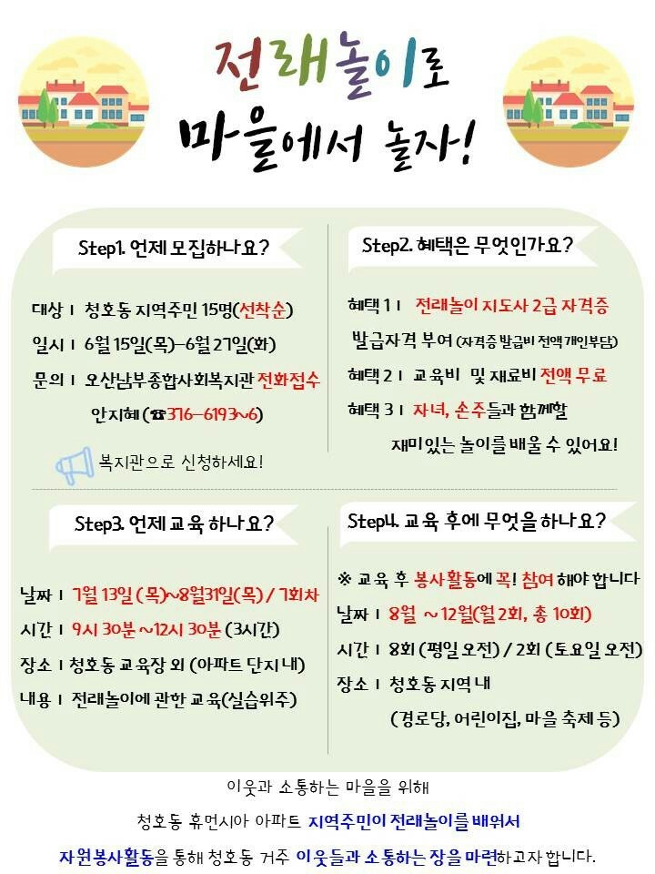 지난 7월 13일~8월 31일까지 청호동 휴먼시아아파트에서는 '전래놀이로 소통하는 마을'이라는 취지 하에 7회에 걸친 전래놀이 교육이 있었습니다.