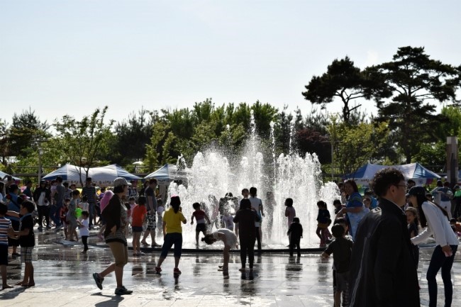 시원하게 흩뿌리는 분수에 땀을 식히며 즐거워하는 아이들