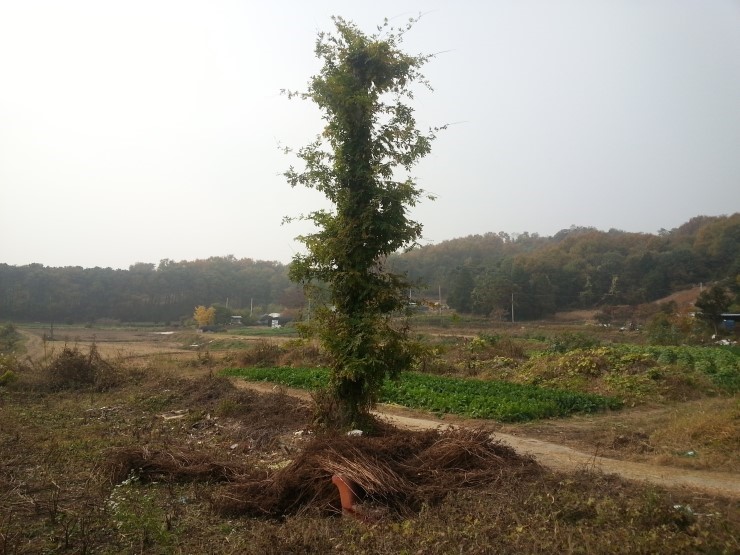 숲 길을 좀 가다 보면 삼거리가 나타나고 확 트인 평탄한 길이 나타난다 눈을 들어 하늘을 한 번 보고, 먼 산등선을 보고 걷다 보면 멋진 그림이 나타나는데 그것은 전봇대를 타고 올라가 공생하는 넝쿨 식물이었다