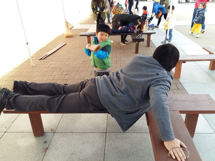 아빠와 조심스러운 널뛰기-넘어질세라 조심조심 엉거주춤 널을 뛰었습니다.