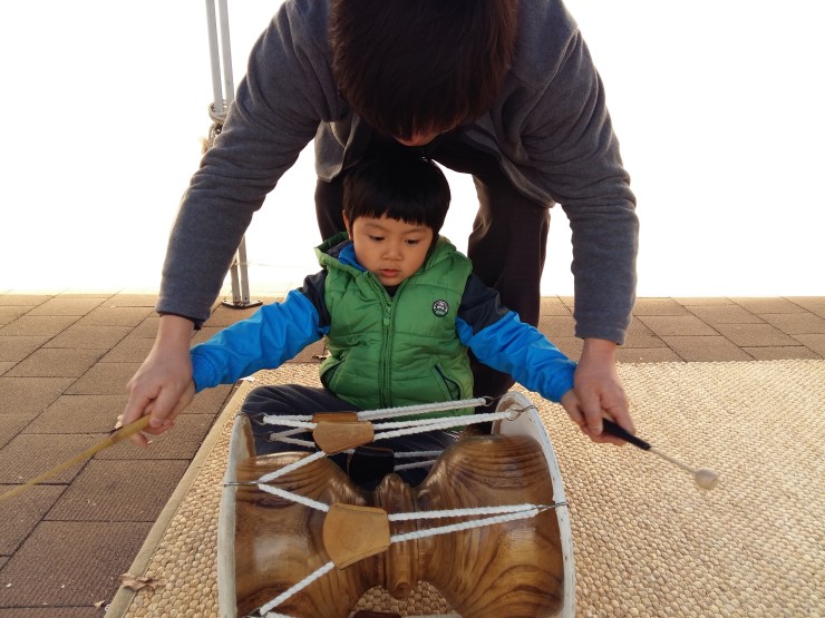 음악시간의 기억을 되살려 아들에게 장구치는 법을 알려주는 아빠
