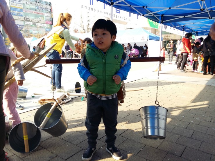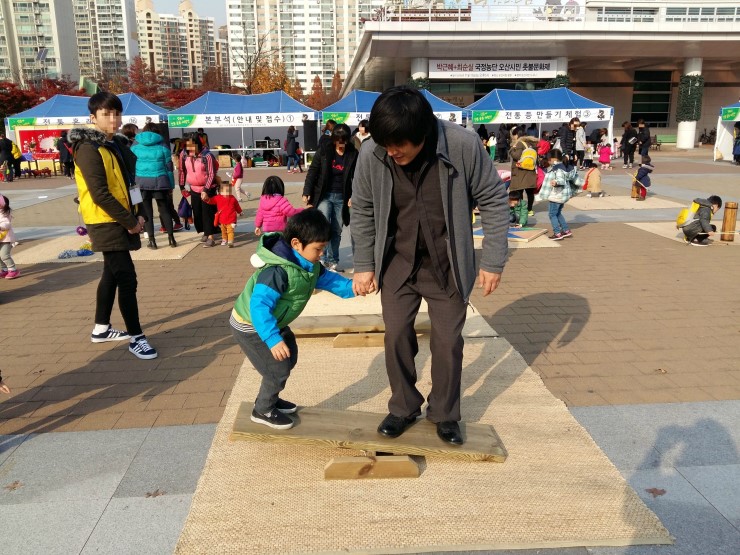 민속촌의 축소판을 가져다 놓은 듯한 느낌의 여러 체험마당들. 전통문화를 체험하는 아이들과 엄마들의 얼굴에는 함박웃음이 가득했습니다. 아직 민속촌에 가 본 적이 없는 제 아들에게는 모든 것이 새롭고 신기했는지 1시간이 넘도록 16개의 체험장을 종횡무진하며 신나게 놀다 왔습니다.