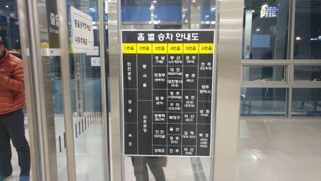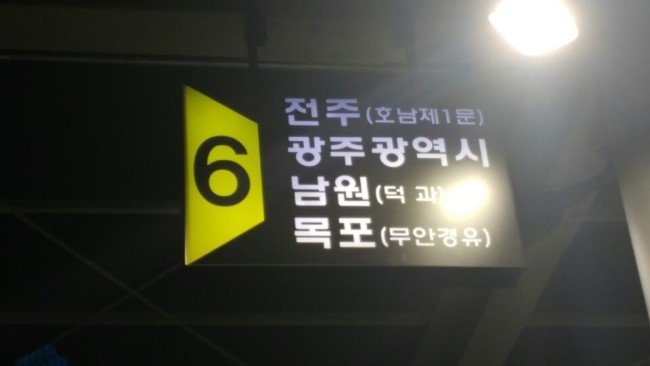 짜잔. 버스 탑승 구역이 여섯 개나 됩니다. 기존 터미널에서는 몹시 좁은 탑승구로, 버스가 몰리는 순간 어마어마한 정체가 진행됐었는데 이렇게 넓은 공간에 지역별로 버스가 나뉘기 때문에 터미널 앞 교통 정체까지도 없어지는 효과를 낼 수 있게 됐습니다.