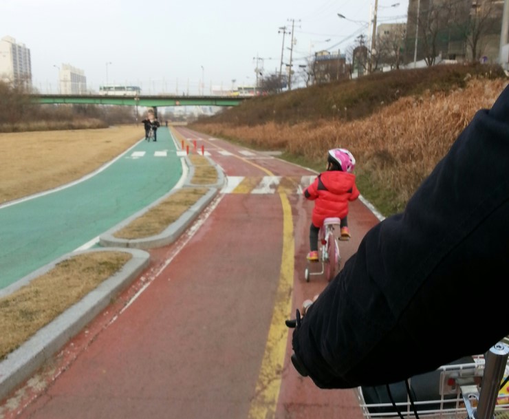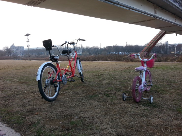 저는 큰 딸과 함께 2인용 자전거를, 작은 딸은 핑크 자전거를 타고 달렸습니다. 자전거가 큰 탓도 있겠지만, 페달 밟는데 너무 힘이 드는거에요... 한 20 여분 달렸을까?