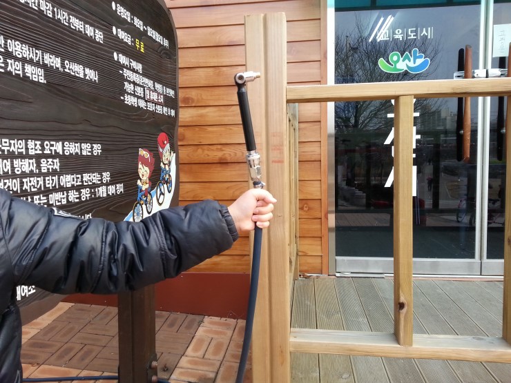 타이어 공기주입기가 비치되어 있어서 자전거를 대여하지 않은 일반 시민들도 자유롭게 이용가능하네요.