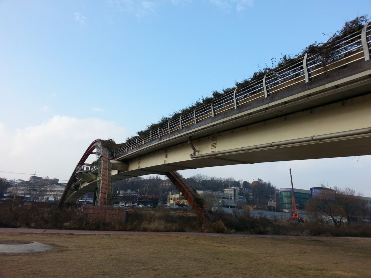 중간에 쉬어가며 에코리움까지 갔습니다. 놀다가 오고 싶었으나, 귀찮아서 자물쇠를 안빌려서 그냥 돌아왔네요. 오산대학 앞 인도교가 파란 하늘과 잘 어울리죠? 봄에 꽃이 피면 더 예쁠 것같아요.