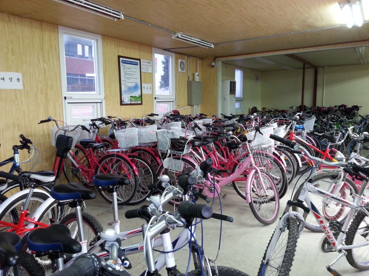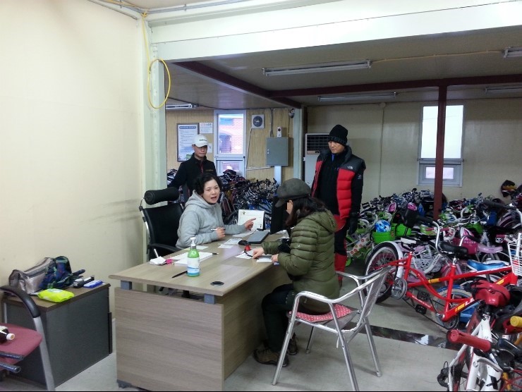 겨울이라서 그런지 이용자가 적어서 원하는 종류의 자전거가 모두 있었어요. 저희집 막내는 물려받은 파란색 자전거가 아닌 핑크색 블링블링 새 자전거를 선택해서 탔네요~^^
