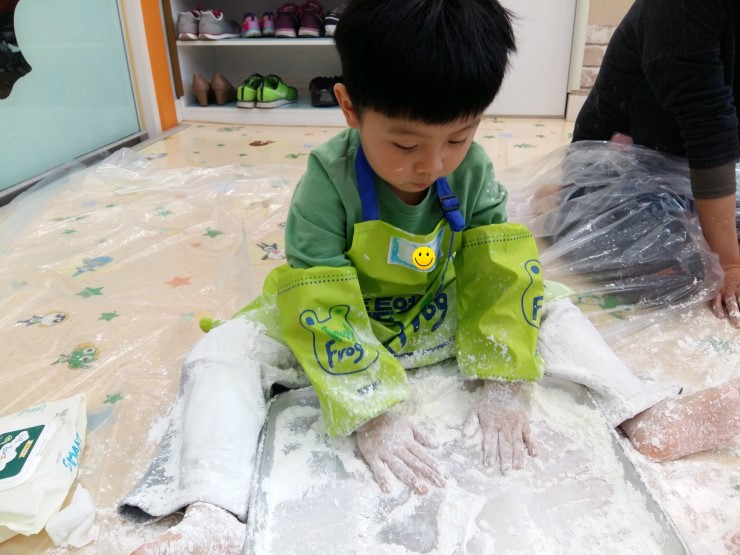 ▲ 본격적으로 가루를 가지고 놀기 시작했어요. 나눠 주신 전분가루의 감촉을 느끼며 한참 눈가루를 뿌려대며 놀았습니다. 전분가루에 가루물감과 물을 넣고 섞어서 부침개 묽기의 반죽상태로 만든 후 그 촉감을 느껴 보고 바닥에 쏟았을 때의 모습을 관찰했습니다. 밀가루반죽과는 달리 액체 상태의 반죽에 전분가루를 좀 더 부으면 고체 상태처럼 응고되는 듯한 촉감이 느껴지고 반죽그릇을 뒤집으면 길게 엿가락처럼 매달리는 모습이 참 신기하더라고요. 한 시간이 순식간에 지나가버렸습니다. 전분가루의 또다른 장점은 물로 쉽게 지워진다는 거죠. 집에서 가루놀이를 도전하기엔 전분가루가 제격입니다. 아이는 정말 좋아하지만 집에서는 쉽게 해줄 수 없는 놀이를 아이맘카페 특강으로 참여할 수 있어서 엄마와 아이 둘 다 만족스러운 시간이었습니다.