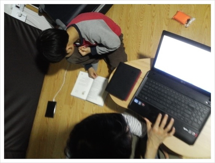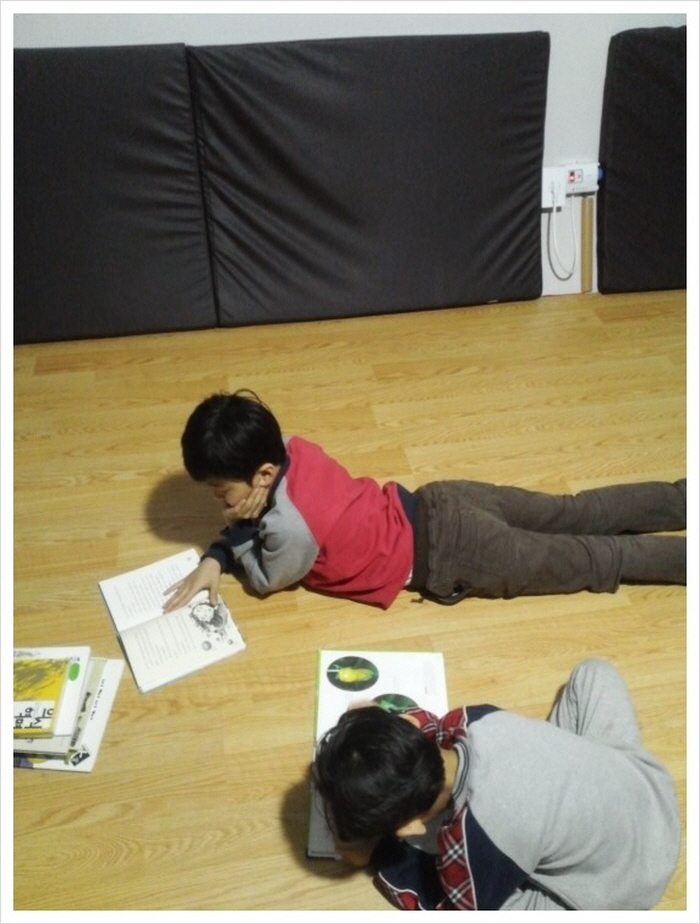 간식을 다 먹고나서 다시 책읽기에 들어갔다. 집에서는 소파에 앉아 TV를 볼 시간인데, 딱히 할게 없으니 아이들은 별 불평없이 따뜻한 바닥에 배를 깔고 계속 책을 읽기시작했다.