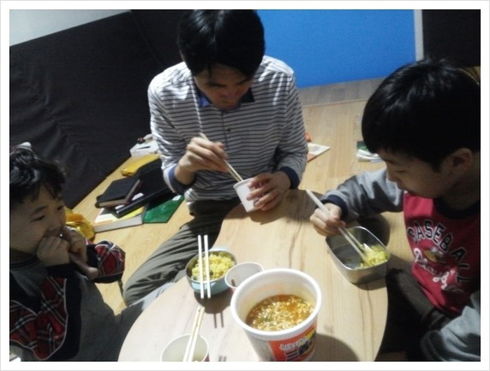저녘 9시를 넘기자 슬슬 배가 고파졌다. 미리 준비해온 과일과 빵 과자등으로 간단히 끝내려 했지만, 아이들이 라면을 먹자고 난리다. 라면도 설거지가 필요없는 컵라면으로 준비했다.