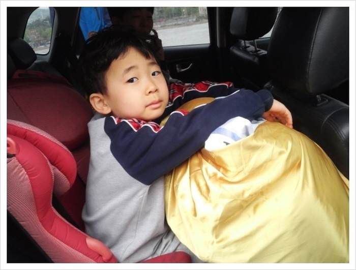 혹시나 추울까봐 겨울 이불을 챙겨오는 바람에 은근히 부피가 커서, 이렇게 아이들이 보따리를 하나씩을 안고왔다. 이불 싸는데는 역시 보자기가 최고다.