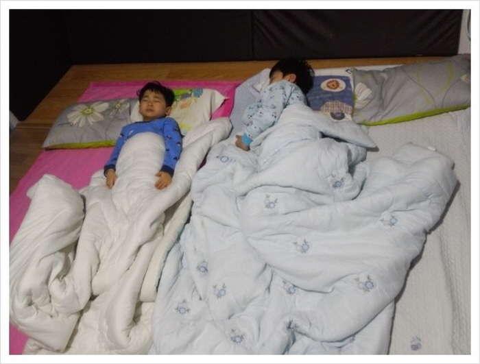 이렇게 책을 읽다가 밤 12시가 되자 아이들이 졸립다고 난리다. 나가서 간단히 씻고와서, 서둘러 이불을 깔았다. 5분도 안되서 두 녀석 모두 완전히 곯아 떨어졌다.