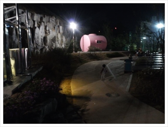 아이들을 재워놓고 숙소 문을 잠근후, 화장실도 갈겸 우리부부는 밤 산책에 나섰다. 밤 10시가 지나면 1층 안내데스크에서 화장실 키를 받아가지고, 도서관 아래에 공원에 마련된 화장실을 이용해야 한다. 이점이 조금 불편했다.