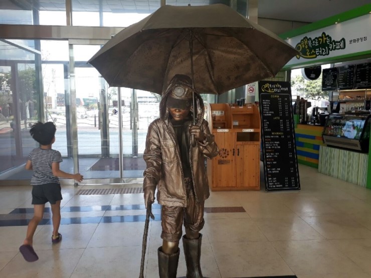 전시관 입구에 '장맛비'라는 제목의 청동브론즈 작품이 눈길을 끌었습니다. 여름 장마 속에 우산을 쓰고 장화를 신은 남자의 모습인데요. 실감나는 형상에 한참 눈길을 준 아이는 어떻게 이렇게 생동감 있게 만드냐며 '소나기'라고 제목을 붙여주기도 하였습니다.