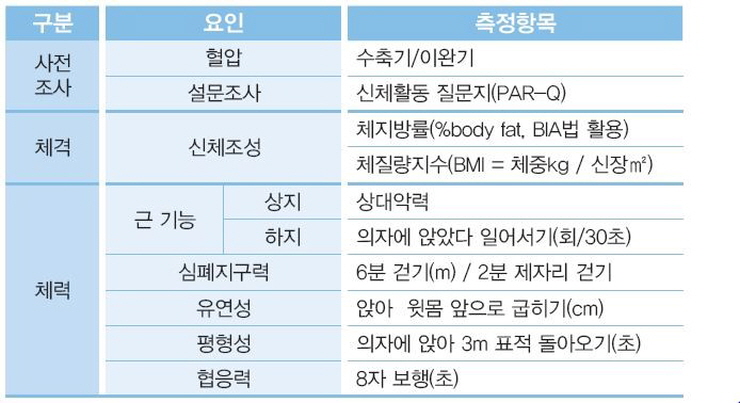 - 노인기(만 65세 이상) 체력측정 항목