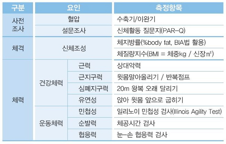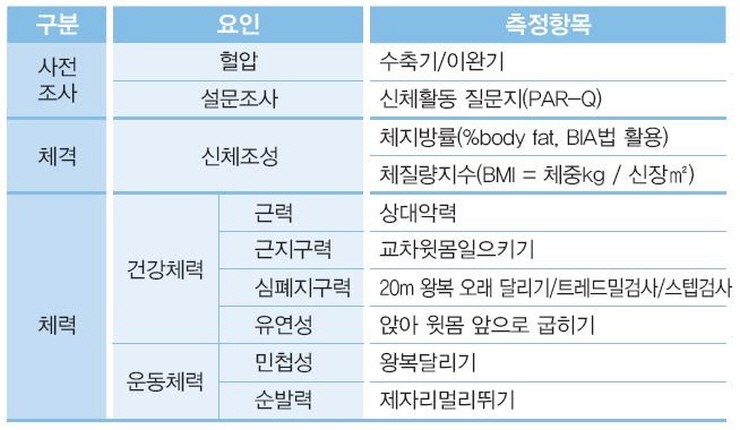 - 성인기(만 19세 ~ 64세) 체력측정 항목