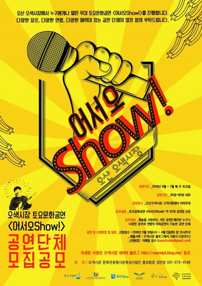 오산오색시장 토요문화공연 <어서오Show>공연단체 참가 공모 오산 오색시장에서 누구에게나 열린 무대 토요문화공연 <어서오Show!>를 진행합니다. 다양한 장르 다양한 연령 다양한 매력이 있는 공연 단체의 많은 참여 부탁드립니다.