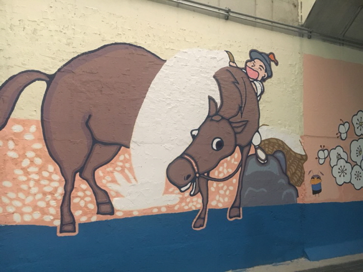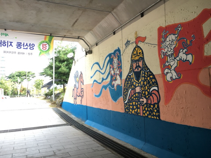 여기에는 오산시 캐릭터 까산이, 독산성 세마대를 지켜낸 권율 장군의 늠름한 모습, 독산성 정상에서 말 등에 쌀을 붓는 모습 등 오산의 역사를 한눈에 볼 수 있는 벽화들이 멋지게 그려져 있고요.