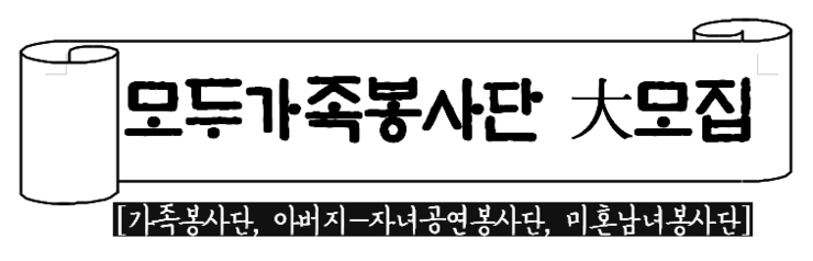 같이 시간을 보내려 여행을 가거나 취미생활을 같이 하는 등 우리는 많은 노력을 하기도 합니다. 이렇게 이 많은 시간을 보내는 것 중 유익한 시간을 보낼 수 있는 방법을 소개해 드리고자 합니다. 바로! 모두가족봉사단 입니다!