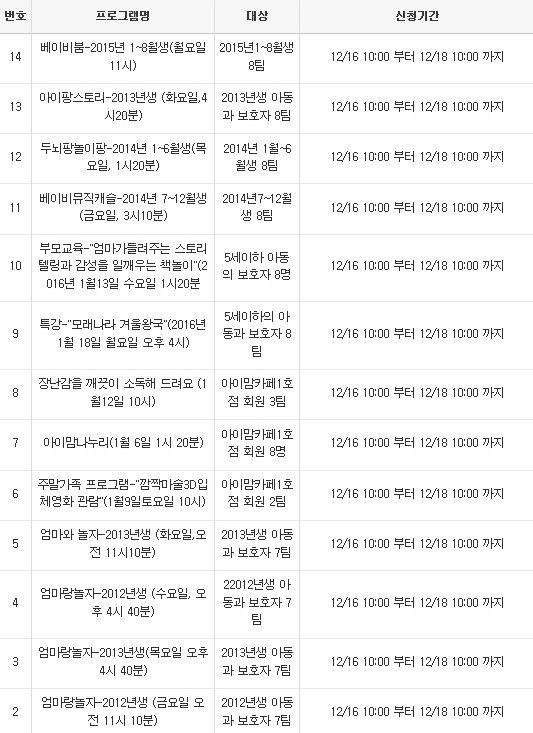 ⊙ 프로그램 이용안내 ▷ 운영기간 - 1회기: 1~3월 / 2회기 4~6월 / 3회기 7~9월 / 4회기 10~12월 ▷ 프로그램접수 - 3/6/9/12월 셋째 주 수요일 오전 10시부터 선착순 마감 - 신청방법: 홈페이지(http://osanilovecafe.or.kr) 회원가입 → 오산시아이러브맘카페로그인 → 프로그램신청 ▷ 재료비 - 놀이프로그램: 프로그램별 재료비 수납 - 엄마랑 놀자: 준비물 또는 재료비 수납 ※ 재료비 납부기한은 개별문자 안내 드리며 기한 내 재료비 미납 시 신청은 자동 취소됩니다. ▷ 참여규정 - 접수하지 않은 자녀의 프로그램 참여는 불가합니다. - 6개월 이상 영유아부터 프로그램 참여가 가능합니다. - 프로그램의 시간대가 오전, 오후에 골고루 분포되어 있어 보육기관을 이용하는 영유아들도 참여 가능합니다. ▷ 2016년 1회기 프로그램 안내