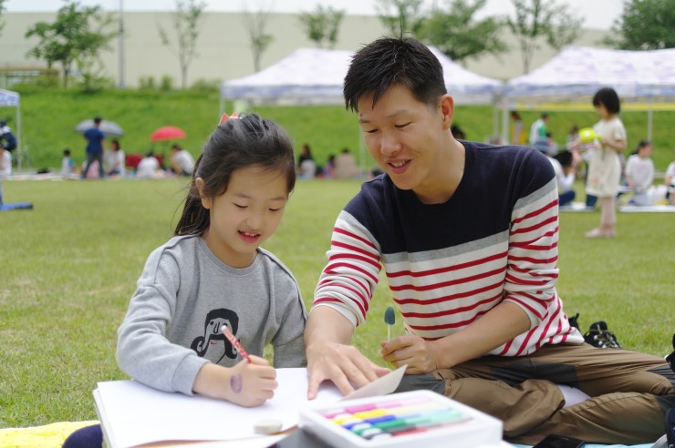 ▲ 오산천에서 아빠와 딸이 함께 그림을 그리는 모습이다. 아빠와 함께 추억쌓기 중인 학생의 얼굴에 기쁨이 묻어난다.