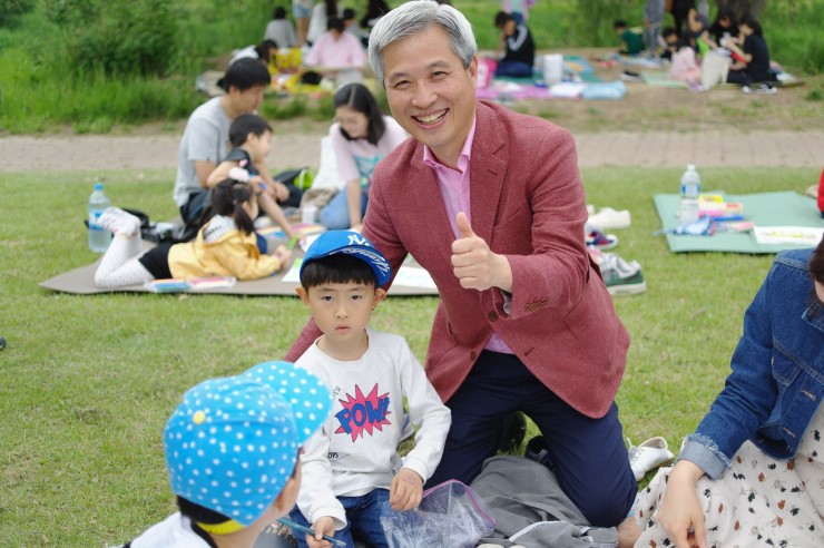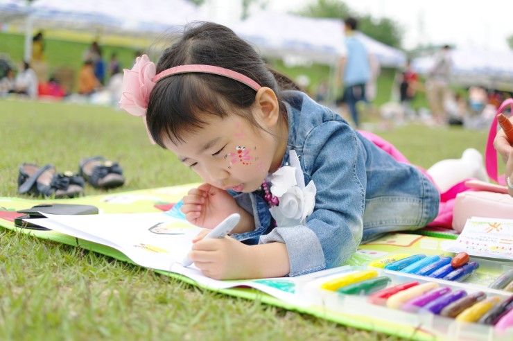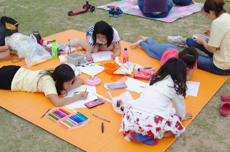 ▲ 주말이 되어 아이들과 함께 추억을 만들고자 오산천 그림 그리기 대회를 찾은 가족이다. 함께 참여한 부모님은 아이들이 자연이 주는 넉넉함을 가지고 푸른 잔디밭에 앉아 감성과 느낌을 마음껏 표현하길 바란다고 하였다. 그림으로 표현하면서 감성 지수도 한층 더 풍성해지길 바란다.