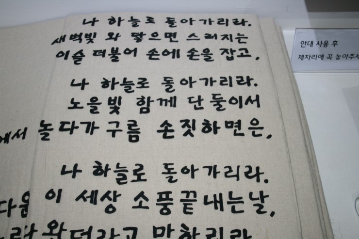 ▲ 제 시선을 고정시켜 놓은 작품이 있었는데요. 시각장애인들을 배려하는 마음에 만져보고 느끼며 읽을 수 있게 만든 '귀천'이라는 촉각도서 입니다. 우리내 인생살이를 소풍에 비유해 소풍(추억)이 끝나고 나면 하늘로 돌아가겠다는 애잔한 시 입니다. 우리 인생도 가을의 석양처럼 붉게 물들다 사라질텐데 삶이 전쟁터인 우리에게 그때가 아름다웠느냐고 묻는다면 과연 아름다웠다고 말 할수 있을지 제 삶을 다시 한번 돌아보게 하는 작품이었습니다.