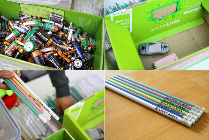 토요일. 아침부터 흐릿흐릿 날씨가 잔뜩 찌부린 날 아침. 오산시청앞 나눔장터가 시작됐다. 시청앞 광장에서 펼쳐지는 오산시 나눔장터. 나눔장터에서는 그냥 버리면 환경오염, 하지만 재활용하면 중요한 자원을 얻을 수 있는 폐건전지랑 폐휴대폰도 모으는 활동을 하고 있어서 집에서 숨어있던 폐건전지랑 오래된 휴대폰을 모아가지고 나갔다. 모금통에다 가져온 물건을 반납하고 나니 내가 제일로 좋아하는 연필을 선물로 주셨다.