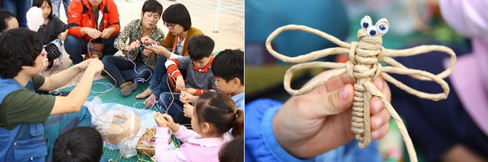 어디서나 장터에서 제일로 인기가 있는 줄은 먹거리가 아닐까 싶다. 이날도 팝콘과 솜사탕가게는 이미 만원... 그 옆에는 끈을 이용해 인형을 만드는 길바닥 강좌가 진행중이었다. 하나둘 장터를 찾은 사람들이 모여 강사님의 지도하에 자신만의 손으로 엮어 하나의 인형을 만드느라 눈빛이 초롱초롱 빛나고 있었다.