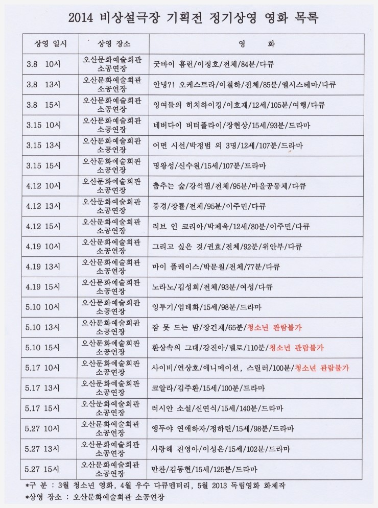 아래의 표, 보이시죠? ![]() 어떻게 이렇게 저렴하게 영화를 볼 수 있는지 궁금하시다고요? 문화체육관광부가 <비상설극장기획전(정기상영지원사업)>을 공모했는데, '제천청풍영상위원회, 마포문화재단, 오산문화재단, 인천영상위원회' 등 4곳이 선정되었다고 해요. 박문정 오산문화재단 기획홍보팀장은 오산문화재단에서 많은 노력을 한 결실을 맺은 것이라 감회가 다른 것 같다며, 많은 시민들에게 홍보가 되어 좋은 영화를 보셨으면 하고 희망을 하더라고요.