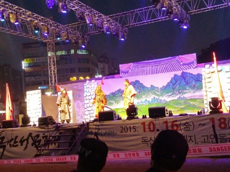 ▲ 첫날은 문화예술회관과 오산대학에서 개막전시와 식전공연으로 전통 타악 퍼포먼스가 열렸고, 둘째날은 죽미체육관에서 전국휘호대회가 독산성과 고인돌공원에서는 다양한 프로그램과 퍼포먼스로 우리의 눈과 귀를 즐겁게 했지요. 지금 위 사진은 전문극단 '벼랑끝날다'와 오산시민 극단이 합친 '독산의 꿈'으로 토요일과 일요일에 펼쳐졌습니다. 임진왜란 당시 독산성에 주둔했던 권율장군과 의병의 승전 이야기를 재미있게 들려주었지요.