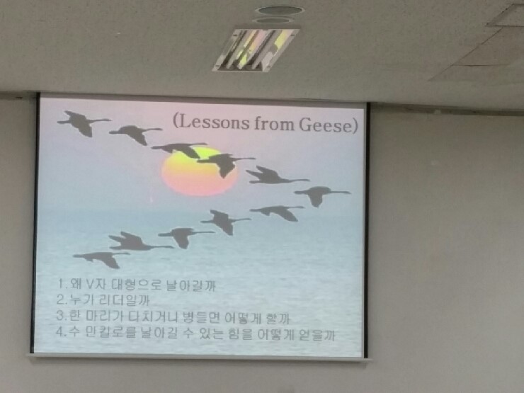▲톰 위삼(Tom Worsham)의 기러기 이야기 중에서 - 기러기는 리더를 중심으로 V자 대형을 그리며 머나먼 여행을 합니다. 앞에 날아가는 리더의 날개짓은 기류에 양력을 만들어 주어 뒤에 따라가는 동료가 혼자 날 때보다 쉽게 날 수 있도록 도와줍니다. 날아가는 동안 끊임없이 울음소리를 냅니다. 그 울음소리는 앞에서 거센 바람을 가르며 힘들게 날아가는 리더에게 보내는 응원입니다.