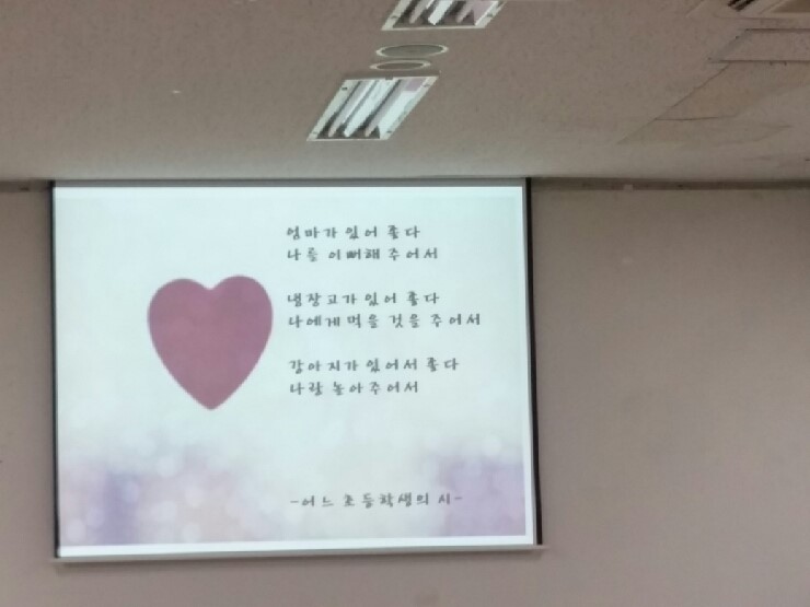 권희정 강사님은, -아빠는 뭐라고 썼을까요? -아빠는 왜 있는지 모르겠다- 며 마지막 싯구를 씁쓸하게 낭독한 아빠가 대답하셨는데요. 갑자기 적막이 흐릅니다. 그 학생뿐 아니라 전반적으로 우리가 느끼는 거라 다들 고개를 떨굽니다. 그러자, 강사님은 환하게 웃으시며, - 괜찮습니다. 여러분들은 이미 아이들에게 충분한 사랑을 주고 계시지 않습니까? 단지, 자녀와의 관계에서 소통(疏通)이 원활하지 못해 잠시 어긋남이 생긴것 뿐입니다.