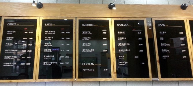 카페의 가격표도 살짝 올려드려요. 아메리카노가 1500원, 제일 고가인 라떼도 3000원이면 오케이! 정말 부담없는 가격이라 날 좋은 날 커피 한 잔 사서 도서관 주변 산책도 좋을 듯 해요.