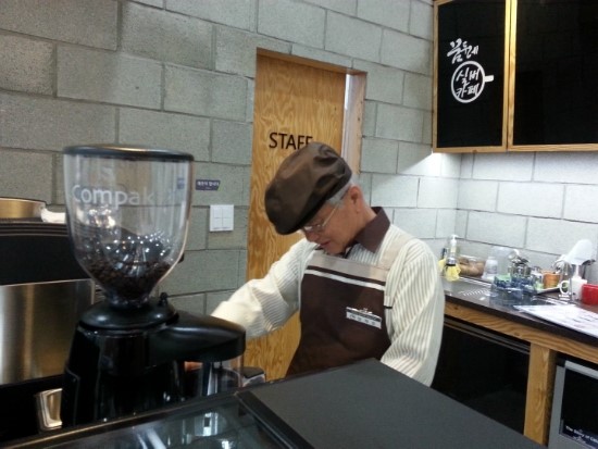참, 설명이 빠질 뻔 했네요. 도서관을 찾은 "어른들"의 코끝을 간지럽히는 커피를 만드는 분들이 있습니다. 오산의 노인 일자리센터에서 교육을 받은 어르신들이 커피를 내려주시는데요. 개관식 준비에 여념이 없었습니다.