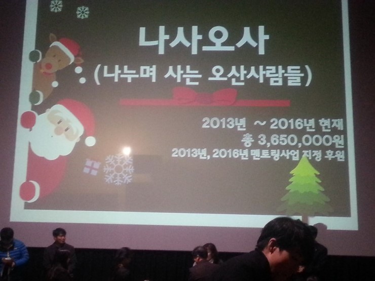 오산남부종합사회복지관(신영묵 관장)은 12월 8일 6시 메가박스 오산점에서 '특별한 사람들의 따뜻한 나눔 이야기' 라는 주제로 자원봉사자 및 후원자 감사의 자리를 마련하였다.