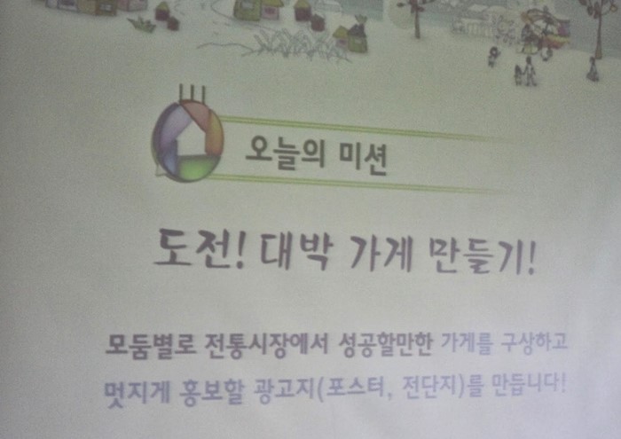 대박 가게의 주제를 하나씩 뽑은 후 대박 가게를 만들기 위한 아이들과 자봉쌤들간의 열띤 토론이 진행되었다.