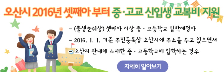 행복한학교, 행복한 지역공동체를 지향하는 교육도시 오산은 교육의 공공성을 위해 복비에 대한 부담을 없애고자 우선적으로 다자녀 가정의 부담을 덜기로 했는데요, 그렇다면 교복비 지원 기준은 어떨까요? 2016년 다자녀 가정을 위한 신입생 교복비 지원 기준 1. 동/하복 교복으로 한정합니다.(체육복제외) 이번 다자녀 가정 교복비 지원은 한 학생당 1회 지원하며 범위를 초과하면 비용은 수익자가 부담합니다. 교복비의 경우 경기도교육청이 마련한 "학교주관구매제도"를 활용하여 지원합니다. 교복은 중고등학교에 다닐 때 입어볼 수 있는 유일한 의복인데요, 교복을 입고 청소년기를 보냄으로써 그 시절을 회상할 수 있고 친구들과의 아름다운 추억을 느낄 수 있는 것 같습니다.